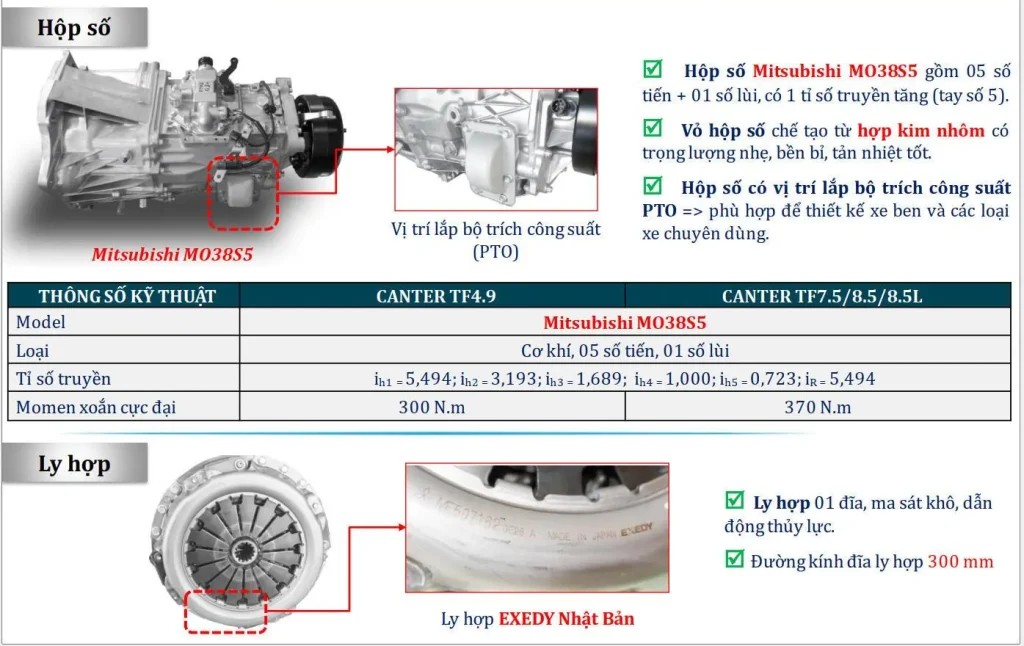 | Ly hợp | 01 đĩa, ma sát khô, dẫn động thủy lực | |