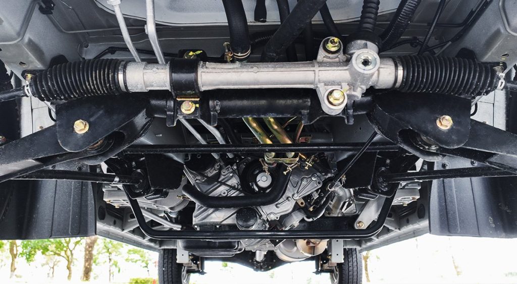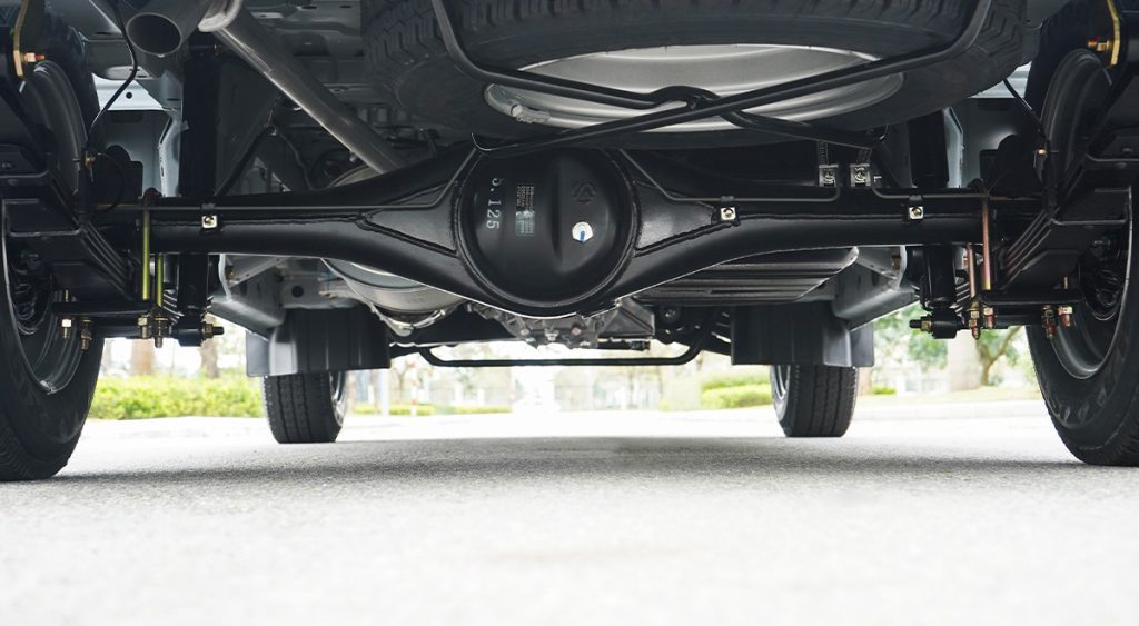 Khung gầm: Cầu trước dạng dầm rời, cầu sau dạng dầm thép hàn chịu tải cao
